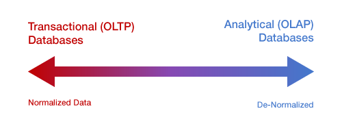 An analytical (OLAP) database maintains data in its most denormalized, or complex, form by storing it in as few tables as possible. The ability to generate reports and statistics on the fly is balanced by slow transactional processing times, where data is often stored and uploaded to the system in batches.